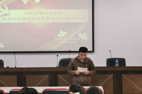 在预备党员转正会议中,张静波、李涵宣读了自己的转正申请及互评,表达了自己成为一名正式党员的决心、自身所具备的条件和对对方的评价与建议。随后,其预备期间的考察联系人介绍其在预备期间的表现,表明本人是否同意其按期转为正式党员的意见。经过表决以上两位同学均成功转正。