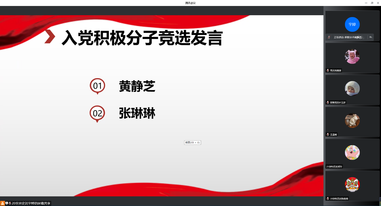推优线上会议开始,支部副书记刘宇婷同志致开场词,介绍了本次会议的相关流程和投票规则。接着进行第一个环节,会议严格按照党组织选举程序进行,积极分子推优评选。按照顺序,2名候选人黄静芝同志、张琳琳同志分别从思想上、学习上、工作上等方面进行了个人陈述,表明了自己入党的心路历程、研究生生活和学习经历和参加积极分子推优评选的理由。