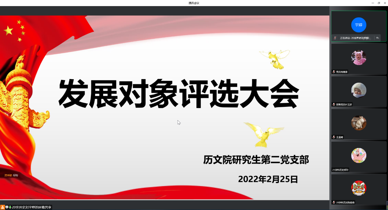 (通讯员刘港源 刘宇婷 黄金洲)2022年2月25日19点,公司研究生第二党支部于腾讯会议线上举行了研究生第二党支部发展对象评选大会线上会议,党支部副书记刘宇婷同志担任主持。参会党员同志超过三分之二,本次会议有效。本次会议共分为三个环节——积极分子推优评选、党员投票流程、支部书记总结发言。