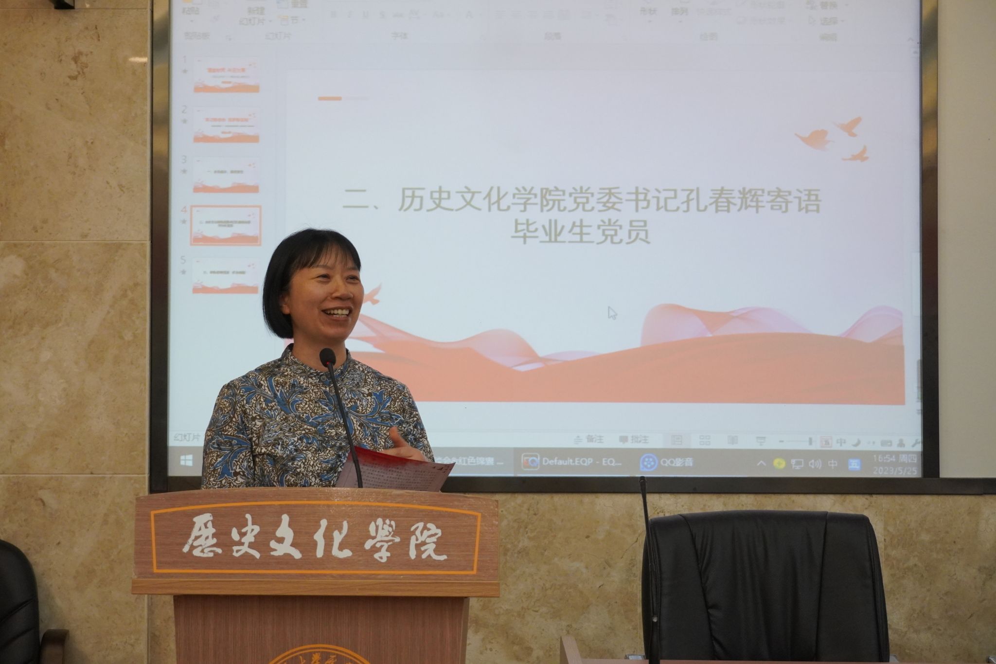 孔春辉、马欣为党员们赠送“红色锦囊”。孔春辉寄语即将离校的毕业生党员:希望大家在今后能做革命理想的传承人,做事业发展的带头人,做人民群众的贴心人,全心全意为人民服务,让党性的光辉闪耀在奋斗的征程上。