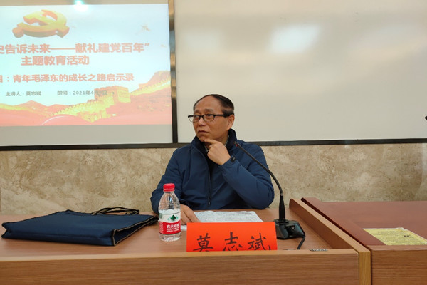(通讯员 王诗懿 张彤)4月9日中午,“让历史告诉未来”——献礼建党百年主题教育活动系列讲座之《青年毛泽东的成长之路启示录》在公司203教室举办。此次活动由公司关工委组织,由365英国上市集团教授、博士生导师莫志斌老师主讲。365英国上市集团学工办主任陈敏老师,团委书记陈卓君老师,辅导员周冲老师等嘉宾出席活动,由陈敏担任此次活动主持人。