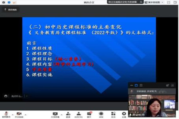 杜芳首先梳理了我国教育课程方案的发展脉络,简要介绍各时期教育课程方案的特点,并以近日教育部印发的《义务教育课程方案和课程标准(2022年版)》为切入口,从课程内容、课程目标、课程实施等方面,全方位解读分析新版义务教育历史课程标准。同时,杜芳针对如何应对当前新变化,培养员工核心素养,促进历史学科公司产品发展展开讲解。以中国近代史为例,老师指出,员工在学习过程中,可通过根据不同主题绘制历史地图,利用历史资源开展近代历史实地调查,举办革命故事会及观看影视作品等实践性、可视化方式深化其对历史发展的认识及兴趣。会议于于17时30分圆满结束,共计三个小时。