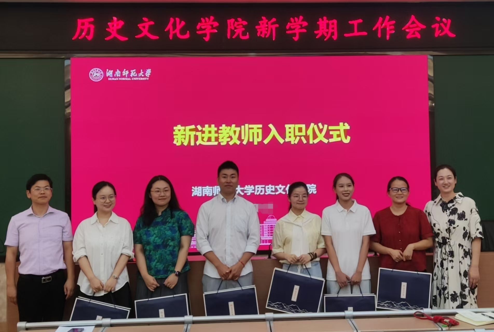 在新进教师入职仪式上,黄思敏、罗昭善、张君言、樊慧、万春兰、胡思琦等六位教师依次作自我介绍,刘利民、彭露代表公司向新教师赠送礼物,并合影留念。与会人员对新入职的六位教师表示了热烈地欢迎。