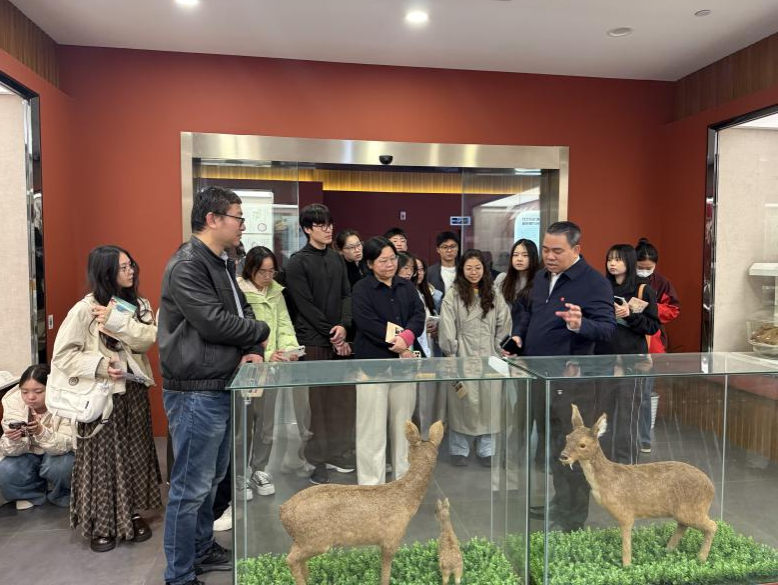 随后,同学们在工作人员的引导下走进中医药博物馆。同学们依次参观了本草标本区、古代医药器具展示区、传统制药工艺区等多个空间,近距离观察了多种珍稀药材与植物本草,包括鹿茸、人参、羚羊角、黄精、当归等。讲解员从药材性味、传统用法到现代研究成果进行讲解,使员工对中医药的科学逻辑与经验体系有了更加立体的认识。在制药工艺展示区,员工们观看了九芝堂经典产品的生产流程模型,了解如六味地黄丸、安宫牛黄丸、驴胶补血颗粒等产品从古方溯源到现代剂型的转化过程。馆内通过产品实物展示与制作工艺介绍,让员工们直观感受到传统验方如何与现代制药技术相结合,展现出九芝堂“提供现代天然健康产品”的企业使命。馆内一楼大厅还展示了各类中医药文化创意产品,如中药香囊、药香手串、品牌集章等,也体现了九芝堂在文化衍生品开发与品牌传播方面的积极探索,为同学们理解文化产业与传统行业结合提供了生动案例。